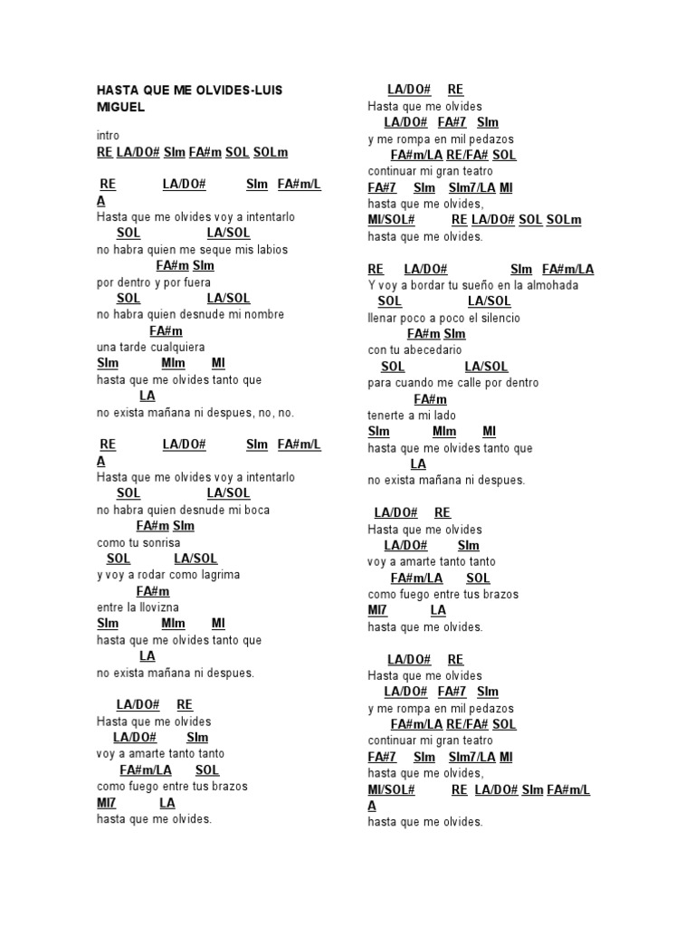 Hasta que me olvides, voy a intentarlo, no habrá quien me seque tus labios por dentro y por fuera, no habra quien desnude mi nombre una tarde cualquiera. Hasta que me olvides voy a intentarlo no habra quien me seque tus labios por dentro y por fuera no habra quien desnude mi nombre una tarde que me olvides. D gb bm hasta que me olvides voy a intentarlo. D f#m bm a hasta que me olvides voy a intentarlo. Por dentro y por fuera, no habra quien desnude mi nombre.